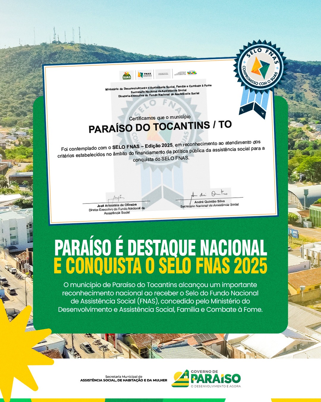 Paraíso do Tocantins conquista Selo FNAS 2025 e é reconhecido pela gestão da Assistência Social