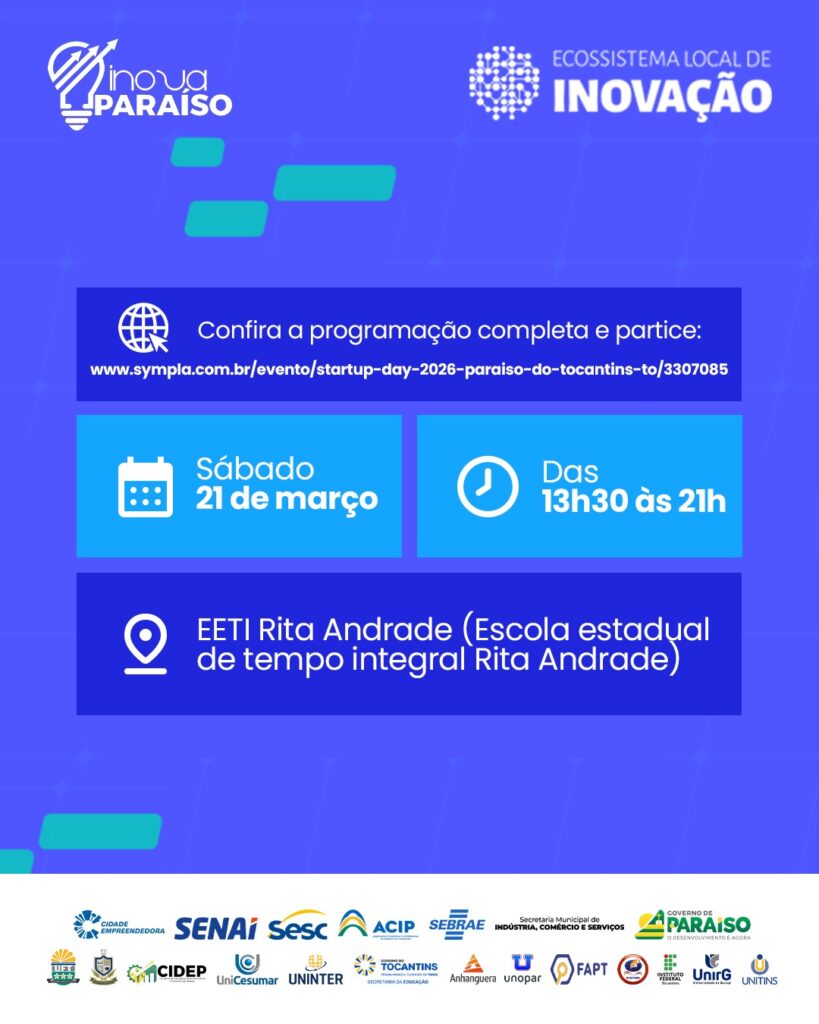Paraíso do Tocantins sediará, no dia 21 de março de 2026, a 12ª edição do Startup Day, mobilização nacional voltada ao fortalecimento do empreendedorismo e da inovação. As inscrições já estão abertas para o evento, que será realizado no auditório da Escola Estadual de Tempo Integral Professora Rita Andrade dos Santos, no Setor Jardim América, reunindo estudantes, empresários, gestores públicos e representantes do ecossistema de inovação.