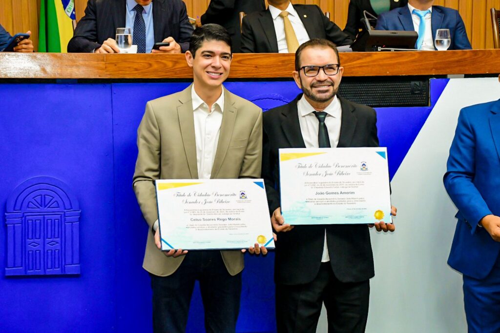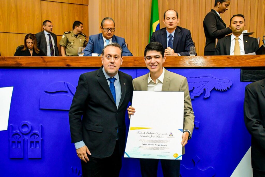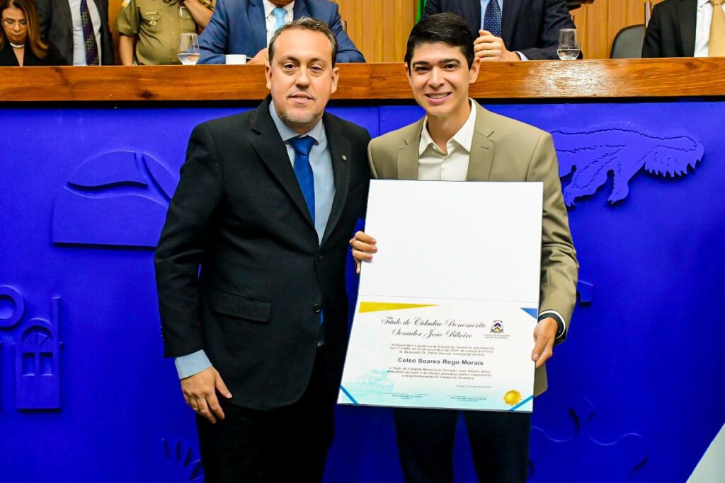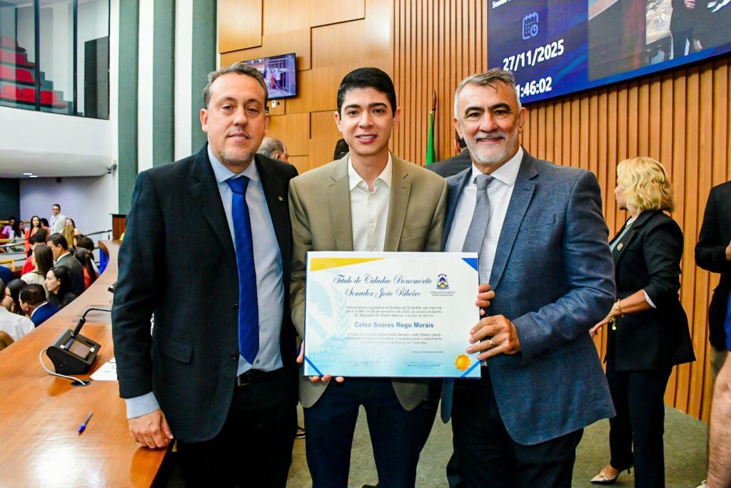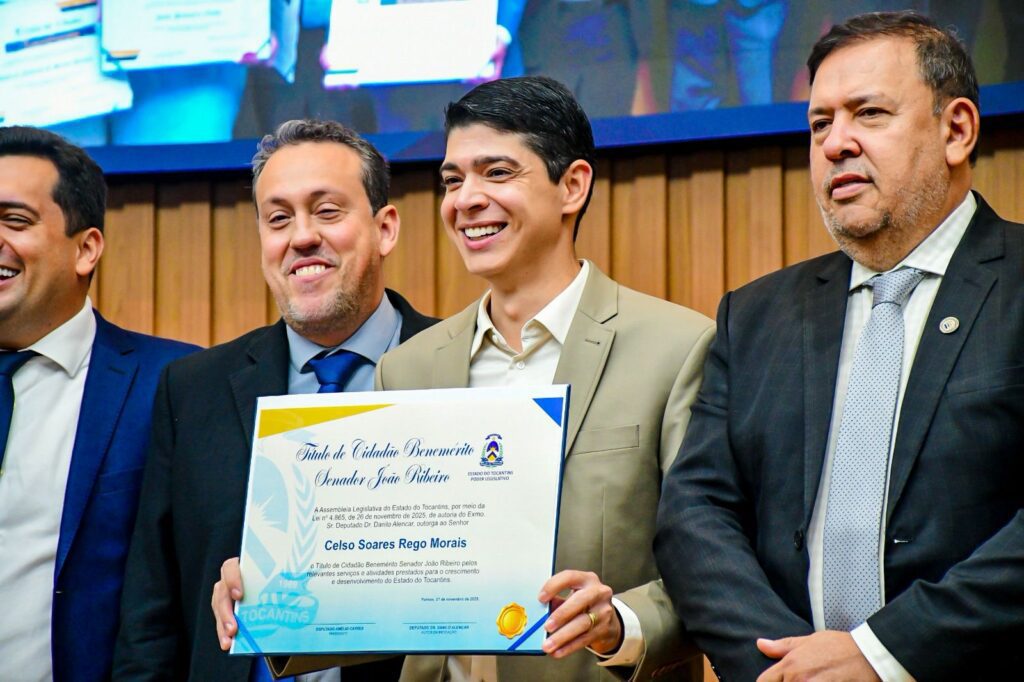 O prefeito de Paraíso do Tocantins, Celso Morais, recebeu na manhã desta quinta-feira, 27, o Título de Cidadão Benemérito Senador João Ribeiro, durante sessão solene realizada na Assembleia Legislativa do Tocantins. A homenagem foi concedida pelo deputado estadual Danilo Alencar, por meio da Lei n° 4.865, de 26 de novembro de 2025, sancionada pelo governador em exercício, Laurez Moreira.