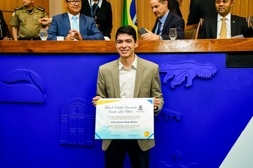 O prefeito de Paraíso do Tocantins, Celso Morais, recebeu na manhã desta quinta-feira, 27, o Título de Cidadão Benemérito Senador João Ribeiro, durante sessão solene realizada na Assembleia Legislativa do Tocantins. A homenagem foi concedida pelo deputado estadual Danilo Alencar, por meio da Lei n° 4.865, de 26 de novembro de 2025, sancionada pelo governador em exercício, Laurez Moreira.