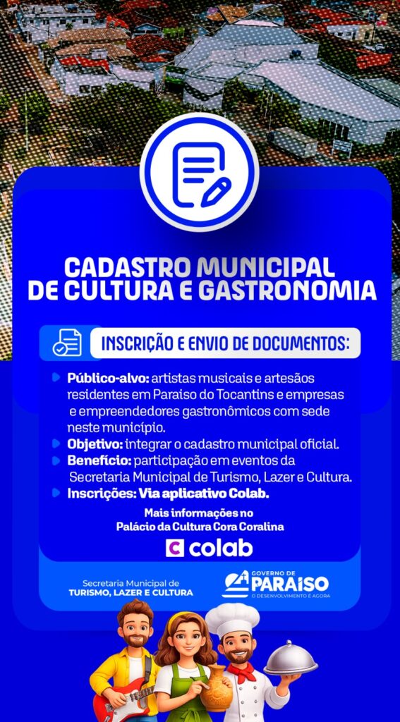 A Prefeitura de Paraíso do Tocantins, por meio da Secretaria Municipal de Turismo, Lazer e Cultura, abre nesta segunda-feira, 9 de fevereiro, as inscrições para o Cadastro Cultural e Gastronômico 2026. A iniciativa é voltada a artistas, vendedores ambulantes e comerciantes do segmento gastronômico do município de Paraíso, que estejam interessados em participar de eventos promovidos pela gestão municipal ao longo do ano.